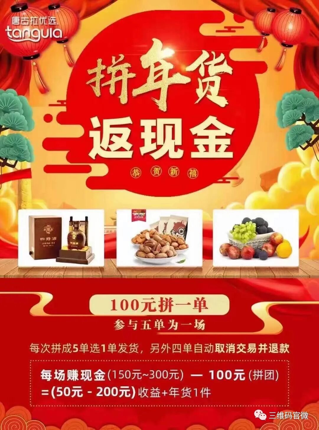 拼中有赠拼不中有赏,100元拼团,百人团随机产生3名幸运拼购者获取超值商品,余97人未获取超值商品者即可获得1%广告费补贴。