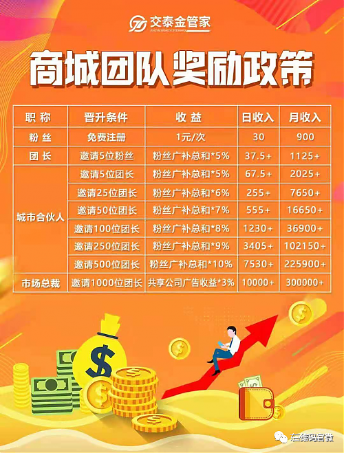 城市合伙人:邀请团长5位,可领取团队广告费补贴总额的5%,团队团长数25位6%,50位7%,100位8%,250位9%,500位10%。