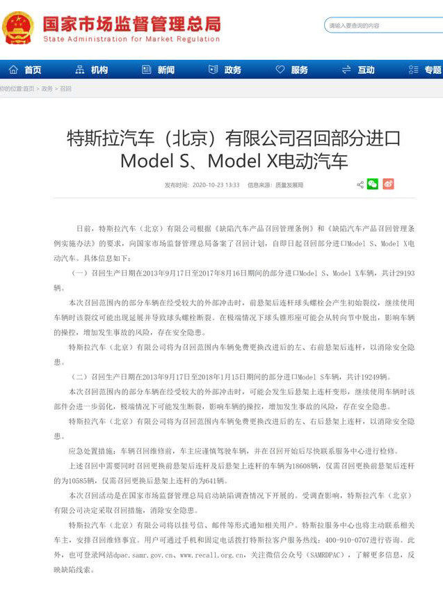 其中最为引人关注的非去年10月的国内召回事件莫属。去年10月23日,特斯拉汽车(北京)有限公司根据要求,向国家市场监督管理总局备案了召回计划,将召回生产日期在2013年9月17日至2017年8月16日期间的部分进口Model S、Model X车辆,共29193辆。