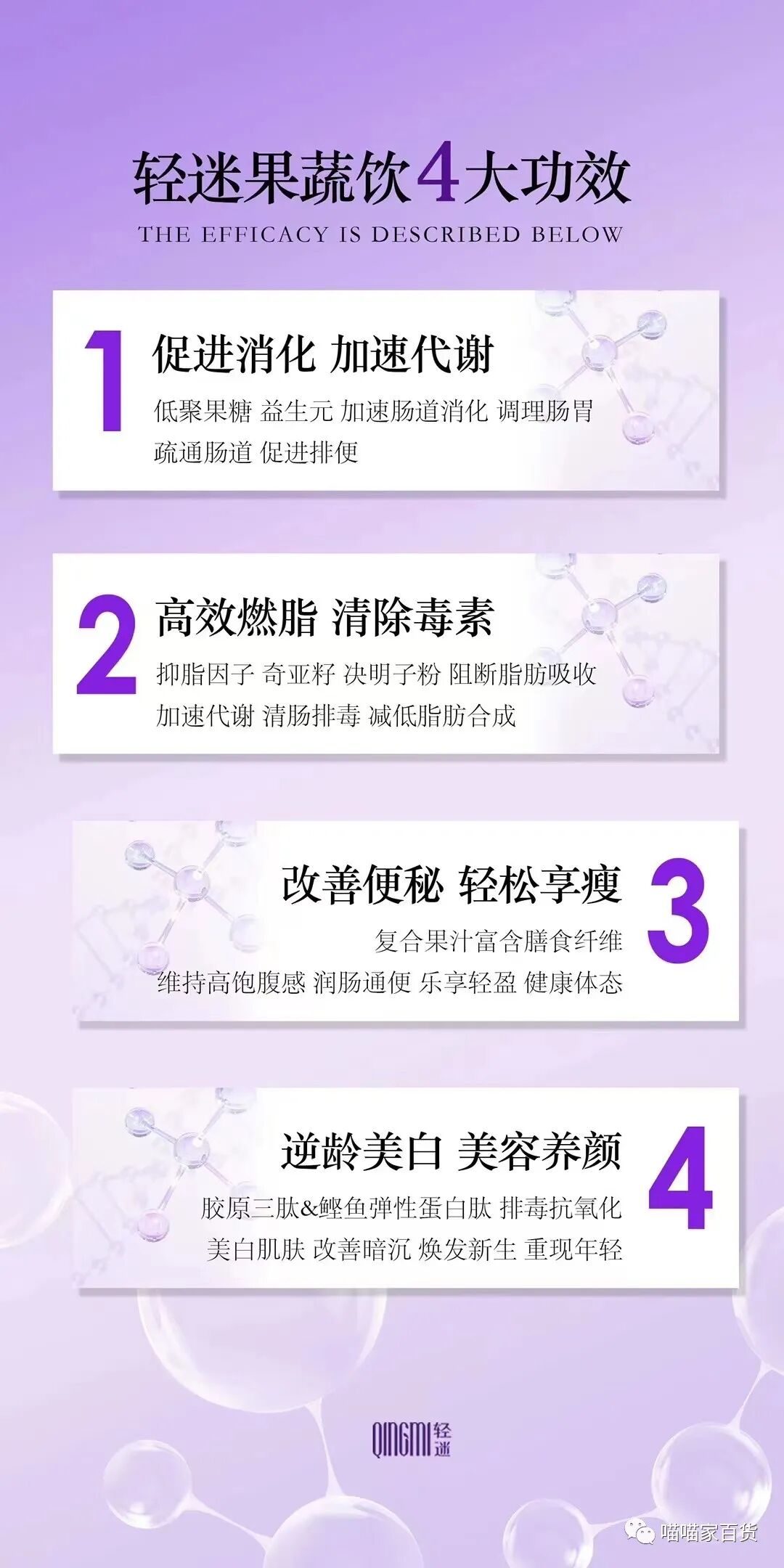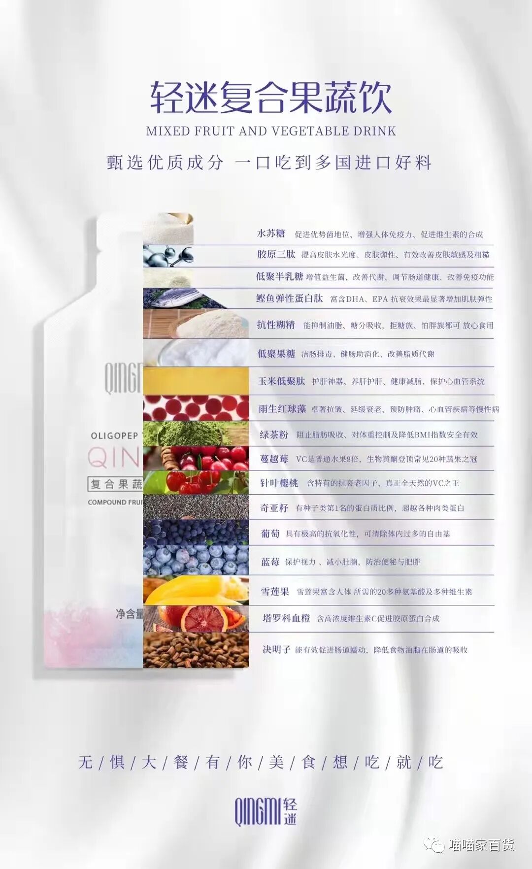 轻迷复合果蔬低聚肽饮上市四年一如既往的火爆,获得使用者一致好评!它的品质与效果真的有那么好吗?为何它能秒杀同类产品,位居销量第一?首先让我们一起来了解一下它的功效: