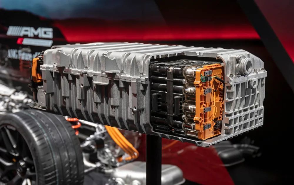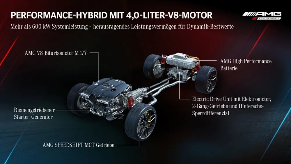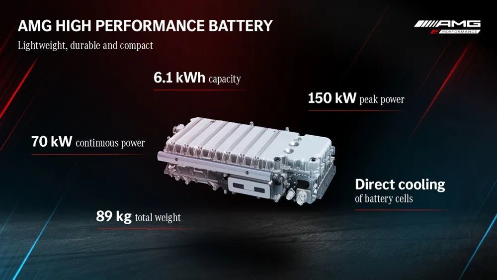 AMG E Performance整套动力总成是源自奔驰后驱平台研发而来,前轴上继续搭载M177 4.0T(V8)或M139 2.0T(L4)发动机,而后轴上则匹配了Affalterbach开发的容量6.1kWh高性能电池,此款电池源自F1赛车,电压400V,重量为89Kg,连续功率可达70kW,峰值功率为150kW、峰值扭矩320Nm,并可持续10秒,用14升特殊冷却液确保在各种工况下电池都能够在45度最佳工况运行。