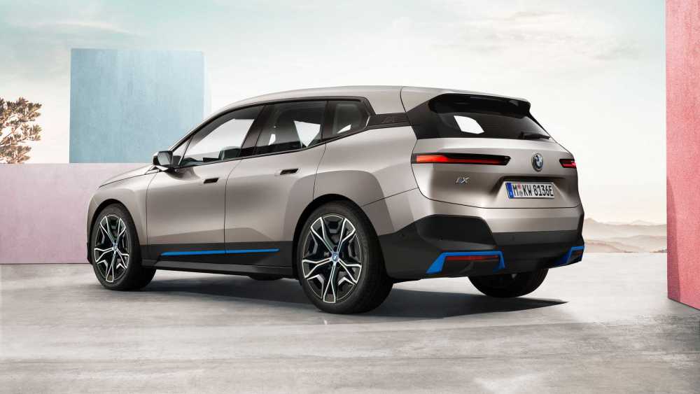 iX提供两种外观设计,标准车型在前后包围和侧裙上方都加入了蓝色饰条,而运动车型在这些位置加入了黑色套件,造型更加激进。