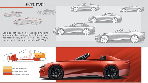 从渲染图来看,新车同样定位两门敞篷轿跑,但整体设计语言更为激进和运动,新车采用了轻量化的设计,运用了大量的铝合金以及碳纤维材质。据消息称未来新车的整车重量有望控制在1361kg左右。在细节上,新车运用了本田对旗下高性能产品的专属设计语言,特别是更加犀利的前灯组、带横向黑色饰条的梯形下格栅以及两侧运用折角设计的进气口。S2000长机舱的特点十分鲜明,腰线从前大灯处延伸至车辆尾部,与车身侧面底部线条有着很好的呼应效果,同时令新车更具侵略性。此外新车还采用了敞篷设计,搭配大尺寸多幅式轮圈,时尚气息也得以提升。