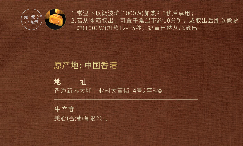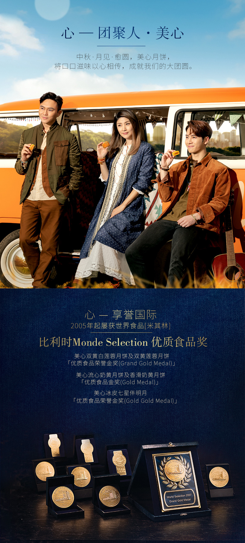 美心月饼心系一处, 坚持香港制造,专注每一个细节,全心投入做出最好的中秋味道。这份对传统月饼品优质高的执着,令美心月饼深获全港市民认同,连续20年香港销量冠军。美心月饼亦持续创新,创作了多款口味崭新的冰皮月饼,更引入「双重烘焗」技术于奶黄月饼,并推出全港首创的流心奶黄月饼,成为城中热 话。多年来美心月饼畅销世界各地,至今已营销至中国大陆、台湾、美国、加拿大、澳洲、新加坡及马来西亚等超过80个城市,享誉全球。美心月饼,以心,传颂 中秋味道。