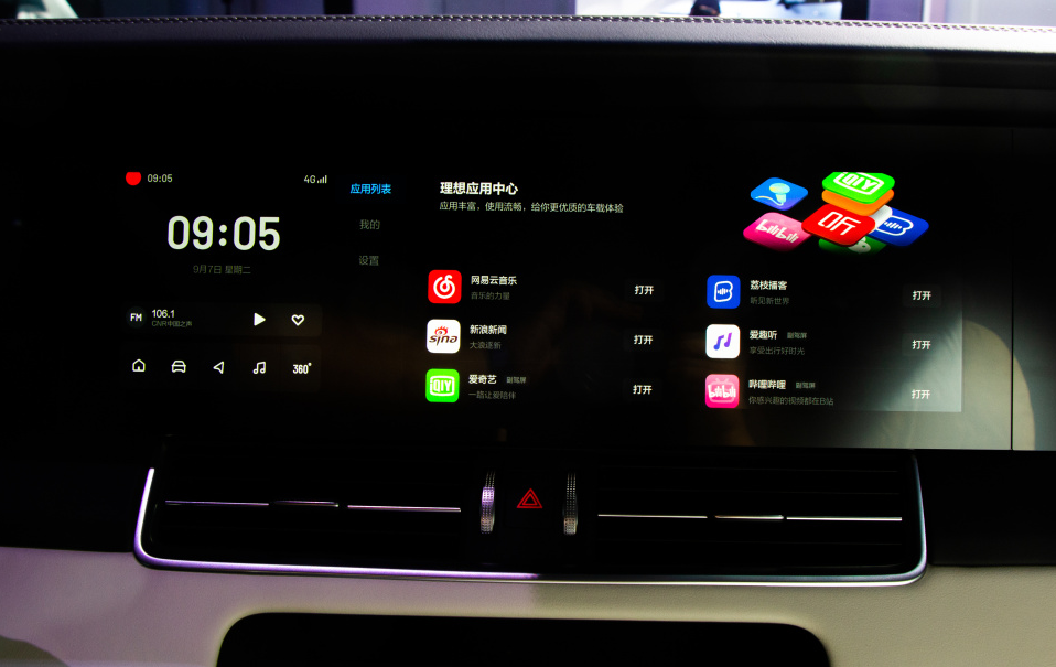 理想ONE的定价要比上述两款车型亲民一点,这车的指导价是33.80万,加上它是新能源车,提车不要购置税,所以实际入手难度并不是很高。在车内,理想ONE拥有多达4块大尺寸的屏幕,每块屏幕都在10英寸以上,整个中控区域可以说是全部由屏幕构成。在方向盘的前方,是大尺寸的全液晶仪表盘,可以显示车辆的各种参数。往右看,则能看到中控多媒体屏幕,它可以显示各种多媒体功能,还内置了应用商店功能,可以从中下载各种应用,丰富车内的娱乐方式。而这些下载的APP,还可以在副驾驶前方的屏幕上使用。至于最后一块屏幕,则是控制面板,各种软硬件功能都能从它这里控制。