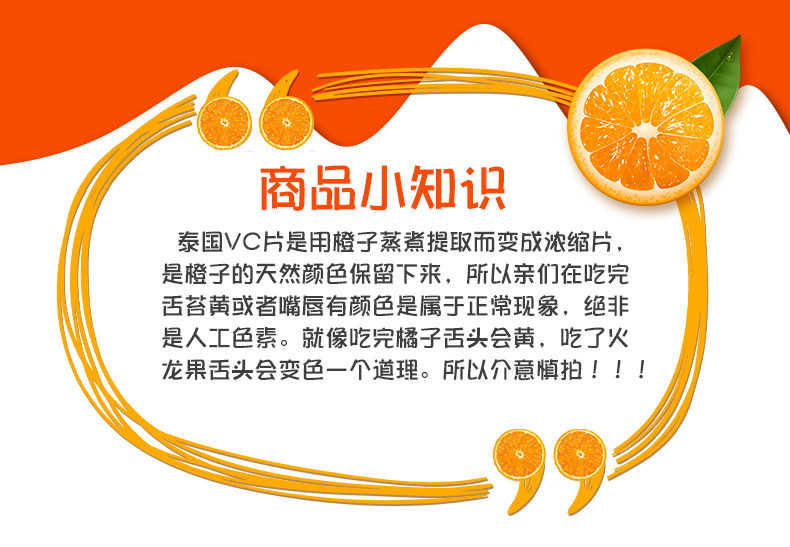 泰国本土维生素C咀嚼片,这款维C是泰国畅销橘子味保健品,品质也相当好,维C成分也不错!长期吃维C儿童可以增加抵抗力,女孩子吃了可以美白祛斑,对皮肤很好哦,牙龈不太好的吃它也很管用!这款维C具有增强免疫力;促进胶原蛋白的形成,使皮肤光滑;具有抗氧化的作用,减少药物副作用、环境污染对身体的损害等作用。